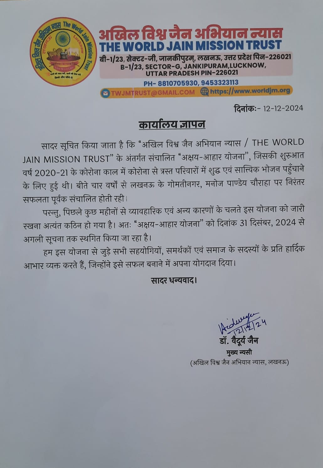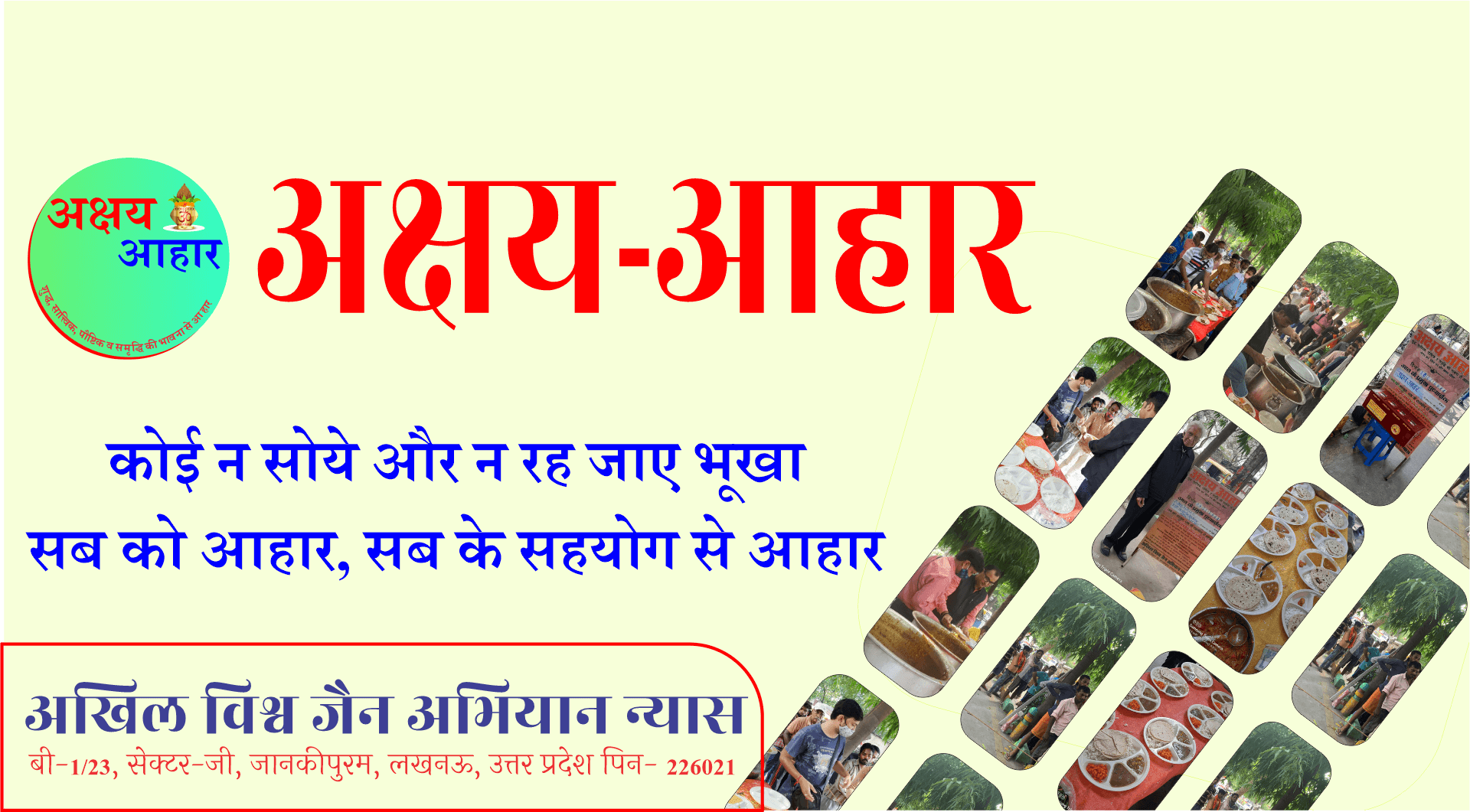 विगत दिनों कोरोना काल में अखिल विश्व जैन अभियान न्यास ने लखनऊ में कोरोना पीड़ितों और तीमारदारों को निःशुल्क भोजन अप्रैल २०२१ से लगातार लगभग ५००० घरों में उपलब्ध कराया था, भोजन वितरण से पहले मंत्र पाठ भी किया गया था, जिस का परिणाम यह हुआ-- जिन घरों में हमारा भोजन गया, उन में से किसी भी घर से कोरोना के कारण मृत्यु का कोई समाचार नहीं मिला और जो राशि हम ने इस निमित्त दान के लिए निकाली थी, हिसाब लगाने पर पता चला कि उस से बढ़ कर राशि बची है और बस, उसी के बाद से ४ अगस्त २०२१ से अक्षय आहार वितरण का कार्य केन्द्रीय विद्यालय के पास, गोमती नगर, लखनऊ में प्रारम्भ किया गया और लगभग ७०० व्यक्ति प्रतिदिन अक्षय आहार ग्रहण कर रहे हैं और अब -तक निरंतर चल रहा है तथा आगे की भी बुकिंग जारी है एवं तभी से लेकर कुछ मित्र यह प्रश्न भी कर रहे हैं कि अक्षय आहार अक्षय आहार क्यों?... यहाँ इस प्रश्न का उत्तर न्यास के मुख्य न्यासी प्रो. वृषभ प्रसाद जैन जी ने इस वीडियो के माध्यम से दिया है। नीचे दिए क्यू आर कोड से भी आप इस वीडिओ को देख सकते हैं।